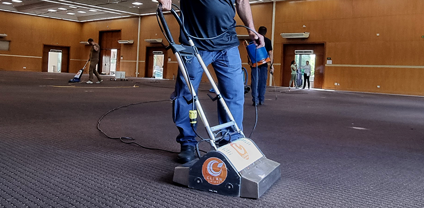 Limpeza a seco de carpetes com alta eficácia, sustentabilidade e rapidez, encapsulando sujeira, minimizando o uso de água e garantindo ambientes saudáveis e visual impecável.