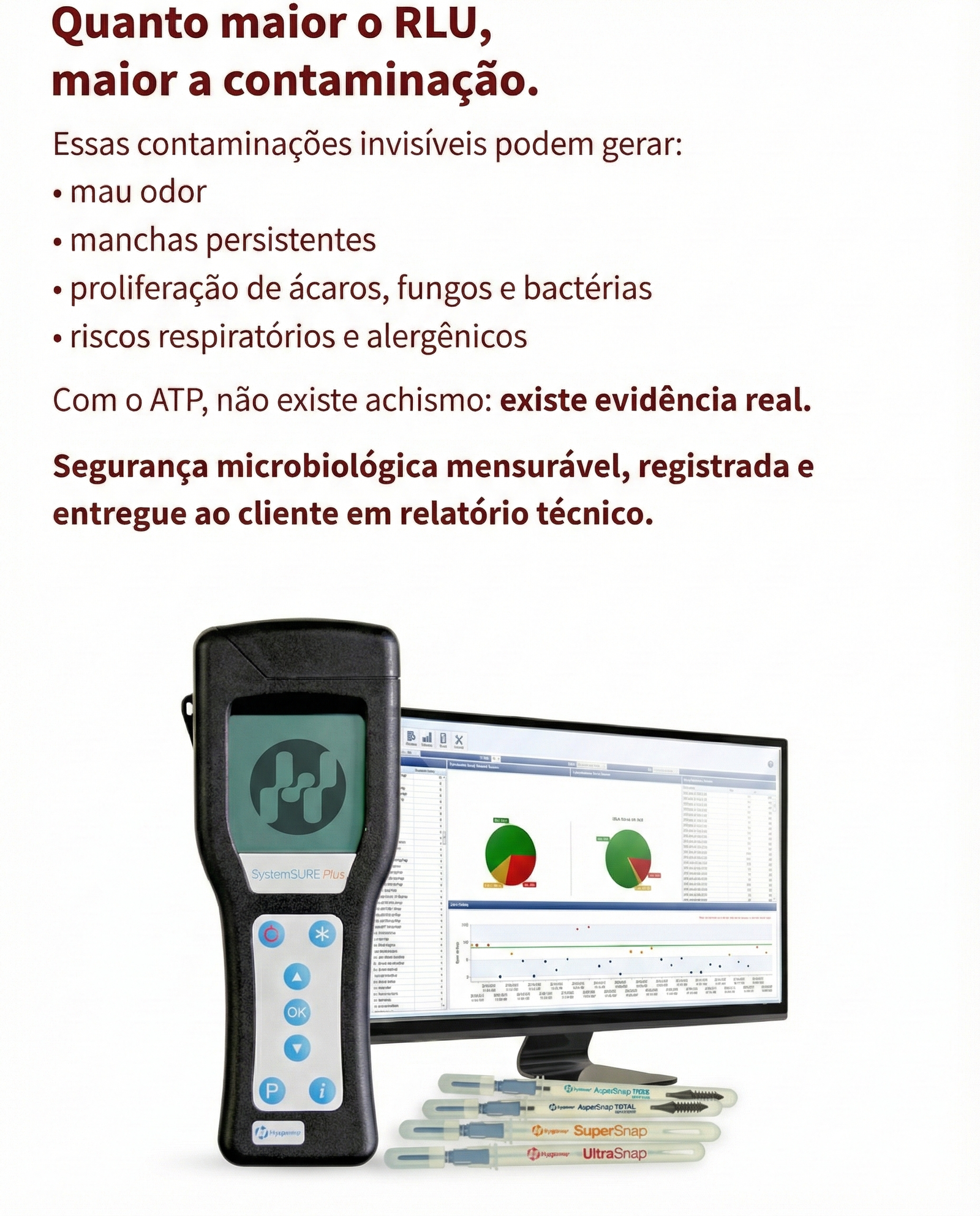 Conceito Chave (Box de destaque): O teste gera um número chamado RLU (Relative Light Units). Quanto maior o RLU, maior a contaminação.